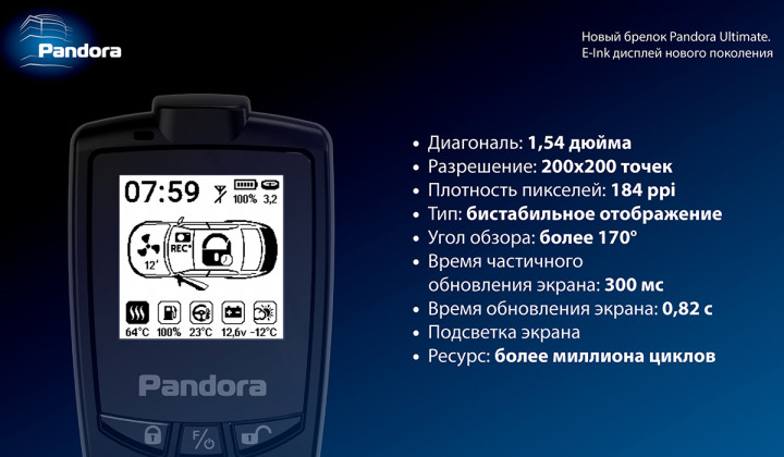Главным нововведением Pandora Ultimate является большой высококонтрастный экран, который легко читается даже в самый яркий солнечный день: Pandora впервые применила в конструкции брелока дисплей на основе технологии E-Ink с диагональю 1,54 дюйма. Эта технология знакома всем любителям электронных книг и известна низким энергопотреблением и отсутствием вреда для глаз.